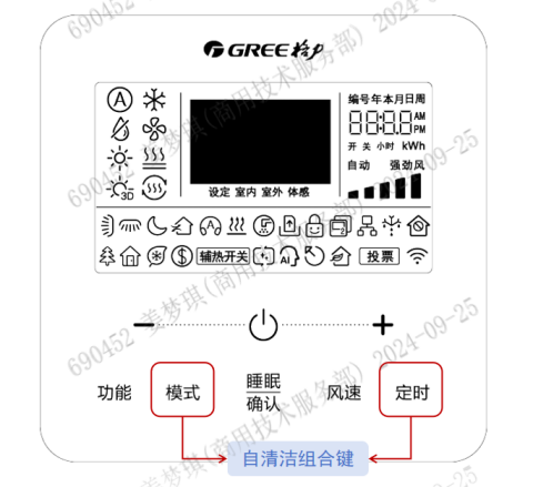1.線控器cao作:空調開機或關機狀態下,同時按住遙控面板的“模式+定時”組合鍵約5秒鐘,即可開啟自清潔功能。若中途想退出該功能,按住“開關”鍵5秒鐘,或者重復按上述組合鍵cao作即可。